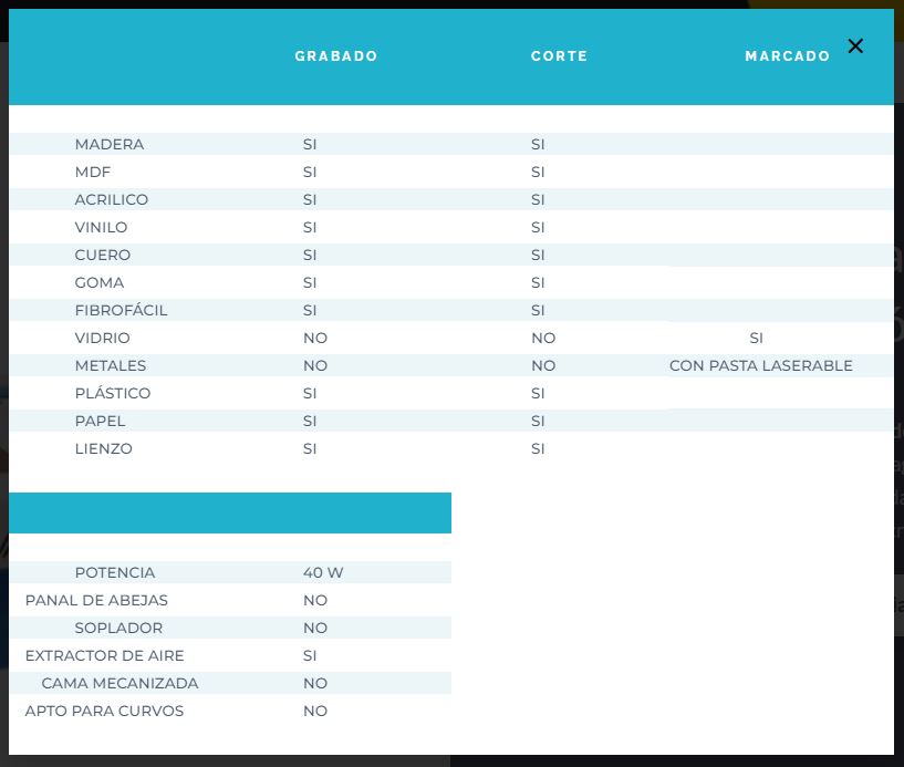 - Potencia láser Cortadora y grabadora: 40W